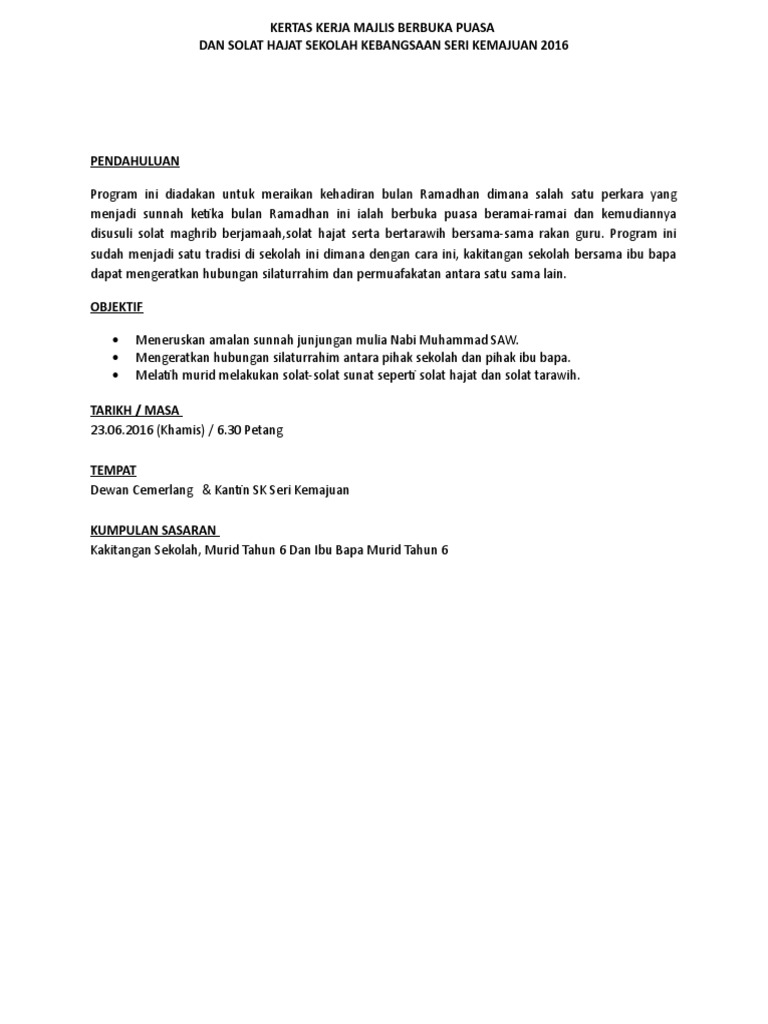 TNB Rai 56 Anak Yatim dan Majlis Berbuka Puasa Peringkat ... from malaysiagazette.com Ihya kertas kerja berbuka puasa. Ibadah ini merupakan amalan yang dapat memberikan pahala besar jika dilakukan dengan sempurna. Selain untuk segera menghilangkan rasa lapar dan dahaga, pada waktu buka puasa merupakan waktu yang baik dan dianjurkan untuk berdoa. Ada beberapa macam bacaan doa buka puasa ramadan yang diriwayatkan oleh abu dawud sesuai sunah rasulullah saw. Salah satu contoh doa berbuka puasa yang pupuler di kalangan masyarakat namun berasal dari hadits yang dha'if (lemah) adalah doa yang berbunyi Doa yang selama ini terkenal di masyarakat, belum tentu shahih derajatnya. Parents, apakah tahun ini rencananya si kecil akan ikut belajar berpuasa? 6) اللَّهُمَّ إِنِّي أَسْأَلُكَ الْهُدَى وَالتُّقَى.